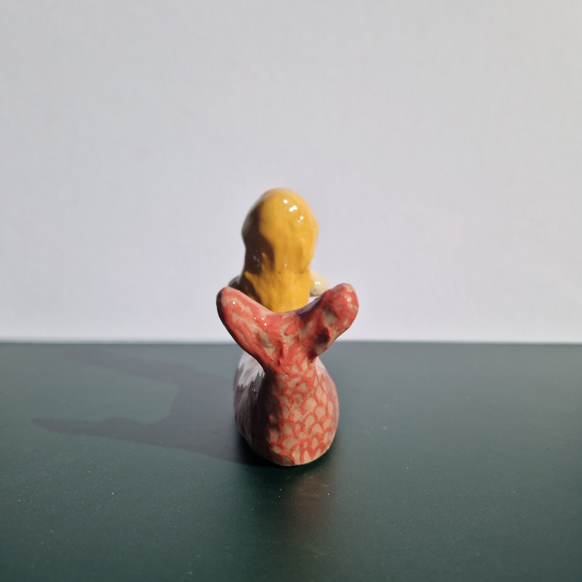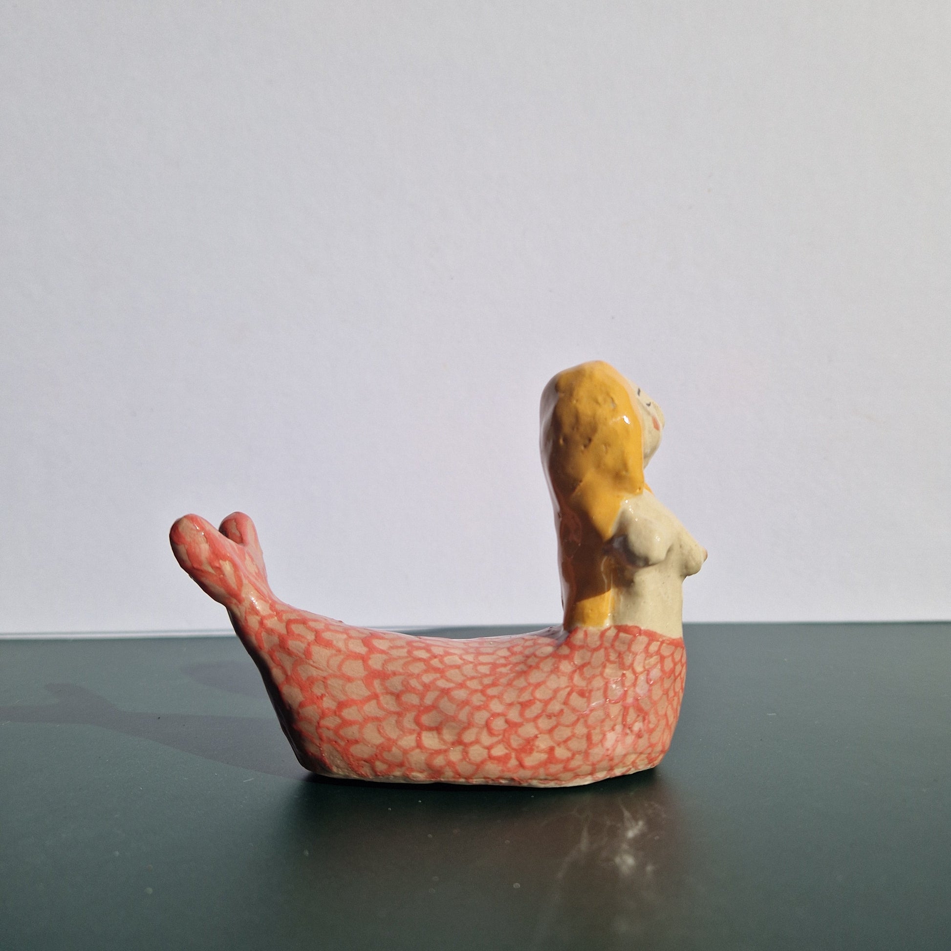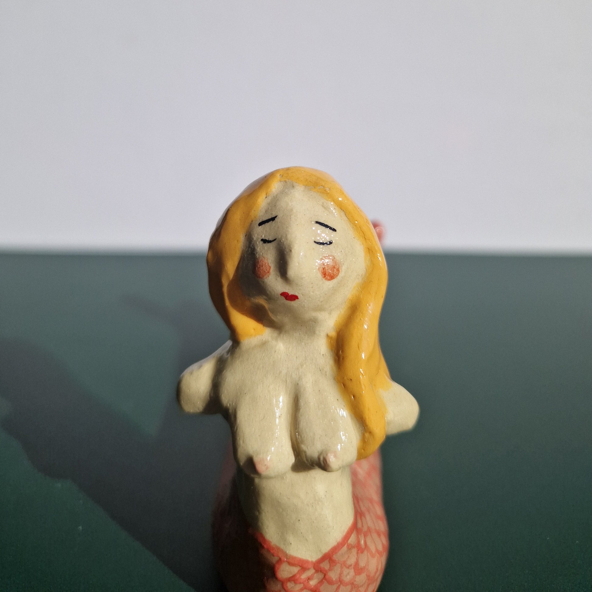 Merenneito vaaleanpunaisella pyrstöllä ja oransseilla hiuksilla. Pyrstössä on kauniit suomuyksityiskohdat. Kasvoilla on kaunis rauhallinen ilme punaisilla poskilla ja kauniilla punaisilla huulilla.